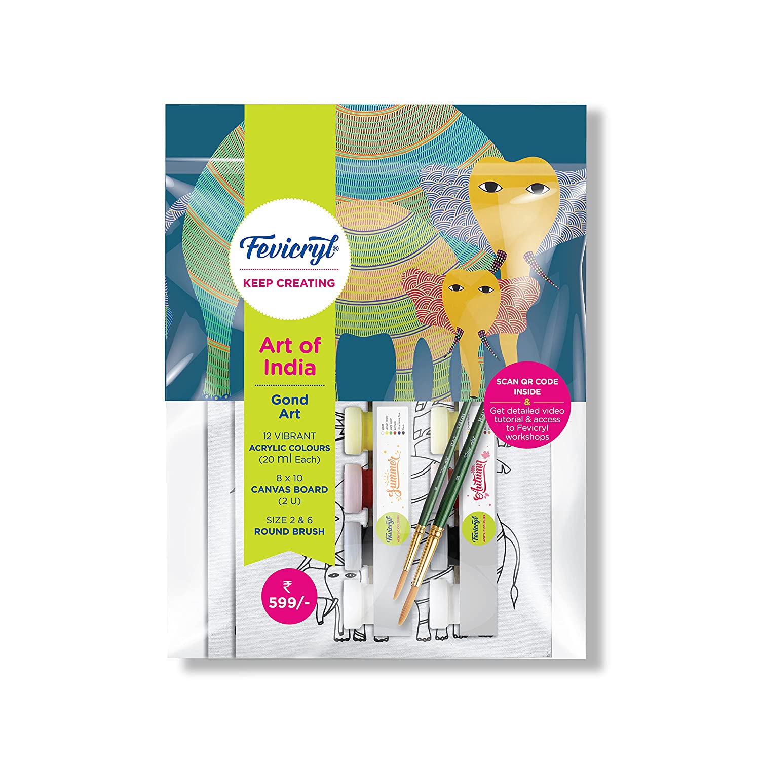 Acrylic Paints 12 shades x 20ml Each, Set of Round Brushes (2U), Pre-Designed Canvas Board 8''x 10'' | Art and Craft for Artists, Students, Children | Best Gift for Artists, Boys and Girls above 10 years| DIY Painting Kit with Workshop Included ALL INCLUSIVE DIY ART SET - An all-inclusive Fevicryl DIY art painting set to get you started with popular Indian art forms like Kalmkari, Gond, Pattachitra KIT CONTAINS -Each DIY Fevicryl Art of India art set contains 12 shades of acrylic colours (20ml) each, Set of Round Brushes (2U), Pre-Designed Canvas Board 8''x 10'' ACCESS FREE WORKSHOP – Scan QR Code on the pack to access complimentary art workshop with the purchase of the kit PROMOTE LOCAL ART – Art design within the Fevicryl Art of India kit is made by a renowned artist with years of experience in the art form of Gond, Kalamkari and Pattachitra PERFECT GIFT – Art of India DIY art painting set is a perfect all inclusive DIY gift for artists. It is also a great gift for students, children who like to paint with acrylic colours and canvas boards AVAILABLE IN 3 INDIAN ART FORMS – These DIY kits are available in 3 art forms like Kalamkari, Gond, Pattachitra.