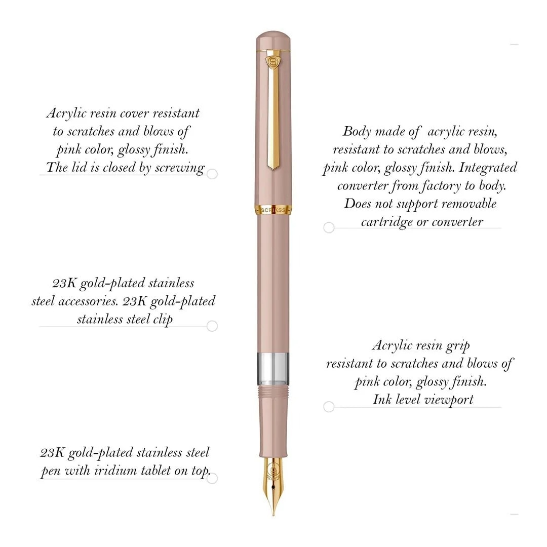 Accessories made of 23K gold-plated stainless steel. Cover made of acrylic resin resistant to scratches and black strokes, glossy finish. The lid closes by screwing. It does not support a cartridge or detachable converter. The window for viewing the ink level. Stainless steel pen plated with 23K gold, with iridium pill on top. Ink feeds stably comes out evenly feels more smoothly Also for a Gift for Birthdays, anniversaries, Christmas, Halloween, Thanksgiving, Father’s Day and Weddings. It naturally combines functionality, robustness and reliability over time.