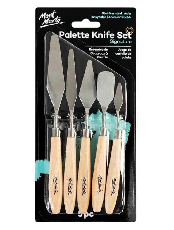 Mont Marte Signature Palette Knife Set of 5 The Mont Marte Signature Palette Knife Set of 5 is a versatile toolset for artists who love texture and bold expression. Each knife features a flexible stainless steel blade with no cutting edge, making it perfect for applying paint directly onto your surface or for mixing on the palette. Ideal for creating impasto effects, laying flat color, or working thick with acrylics and oils. Whether you're a beginner or an advanced artist, this set supports creativity at every level. Set of 5 palette knives in assorted sizes and shapes Flexible stainless steel blades for smooth application No cutting edge – safe and easy to handle Ideal for impasto effects, flat colour application, and paint mixing Works well with oil, water mixable oil, and acrylic paints Suitable for use with Mont Marte paints and mediums Great for abstract art, texture building, and layering techniques Comfortable handles designed for ease of use Easy to clean – wipe with cloth before paint dries Use With: Mont Marte Oil Paints Mont Marte H2o Water Mixable Oil Paints Mont Marte Dimension Acrylic Paints Mont Marte Satin Acrylic Paints Mont Marte Mediums Handy Tip: Do not allow paint to dry on the blades – always wipe clean after use with a cloth.