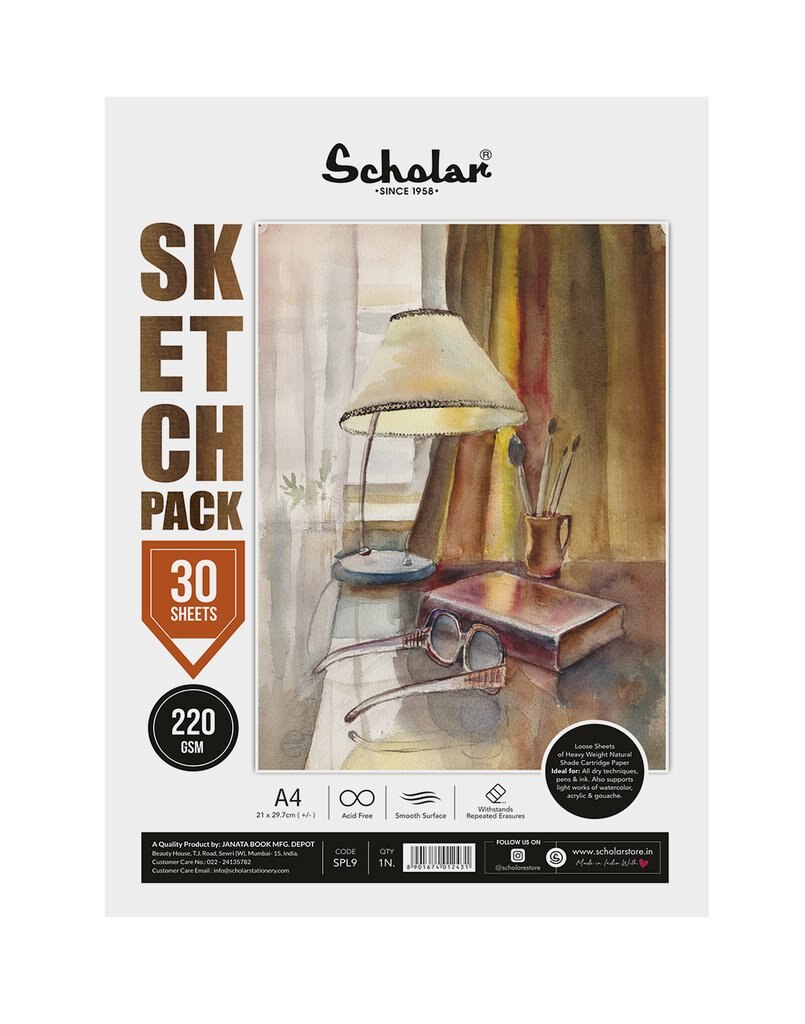 Natural Shade Cartridge PaperAcid FreeLoose SheetsSmooth SurfaceRecyclable Poly-bagSheets per packet: 30Size : A4Orientation : PortraitDimensions (in cm) : 21 x 29.7Gsm : 220